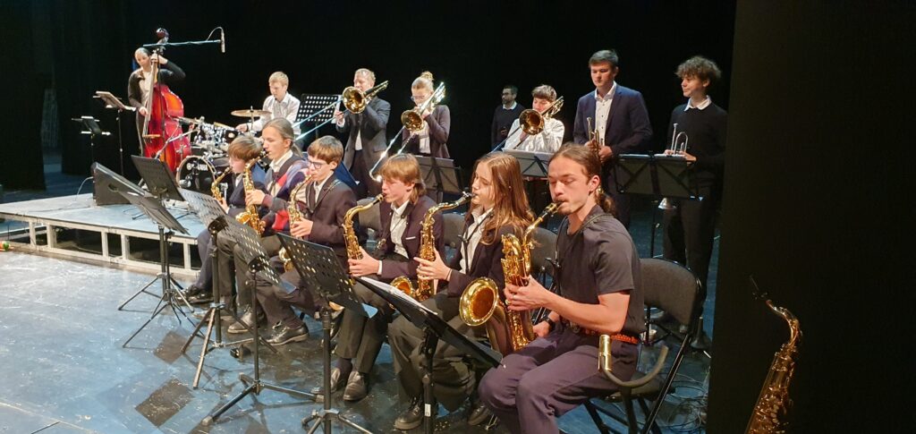 In der Band „BlueX“ musizieren zwölf Musikerinnen und Musiker im Alter von 13 bis 50 Jahren. Das Repertoire umfasst Jazz-Standards aus Dixieland, Swing, Bossa Nova und Soul-Jazz, aber auch Klassiker aus Rock und Pop.