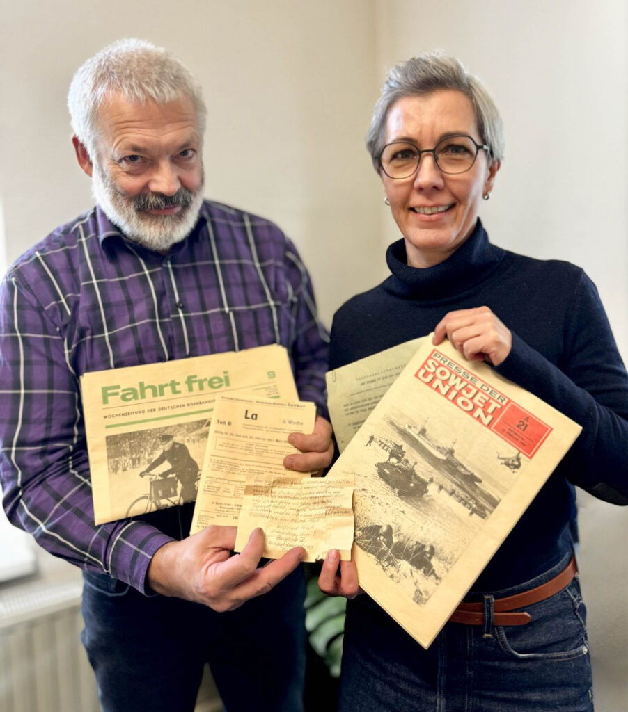 Silke Schlegel, Leiterin des Eigenbetriebes Kreismusikschule/Kreisvolkshochschule (im Bild mit Amtsleiter Valentin Opitz) freut sich über den Fund der Zeitkapsel mit einem kleinen Brief, in dem der Verfasser auf eine erlebnisreiche Zeit in diesen Räumen zurückblickt. Er blickt auf schwere Stunden und auf schöne Stunden. „Und nun stehen wir hier. Wir blicken voller Vorfreude auf diese wunderbaren Räume. Und wir hoffen natürlich, dass wir vor allem viele schöne Stunden hier verbringen dürfen. Schöne Stunden, in denen Musik erklingen kann.“
